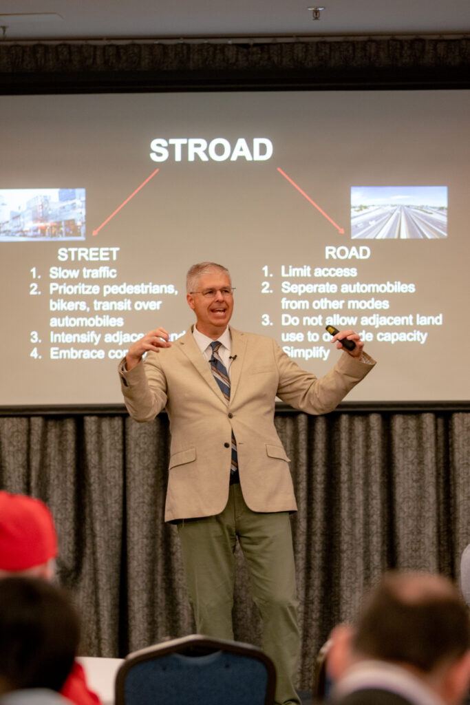 In his book tour presentation, Chuck demonstrates how the values of engineers and other transportation professionals are applied in the design process, and how those priorities differ from the values of the general public. By showing how transportation investments are a means to an end and not an end unto themselves, Chuck reveals how the standard approach to issues like fighting congestion, addressing speeding, and designing intersections only makes transportation problems worse, at great cost in terms of both safety and resources. By contrast, the Strong Towns approach to transportation focuses on bottom-up techniques for spending less and getting higher returns, all while improving quality of life for residents of a community.