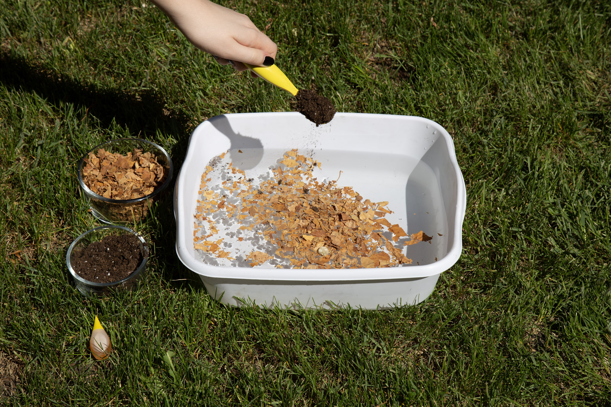 Step 2: Put in the leaves/woodchips/grass. Tell the child that this is like garbage and pollution that gets into the rivers, lakes, and oceans. Explain how this represents what happens when someone throws garbage into the lakes and rivers, or when someone throws garbage on the ground and the wind blows it into waterways. Get the child to try scooping out the “garbage” with a spoon. They can scoop it out onto the grass or into another bin. Ask them how they can prevent garbage pollution from happening. A few examples include: finding the right place to put your waste, recycling as often as possible, and reducing the use of single-use plastics.